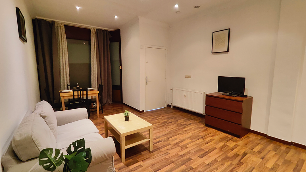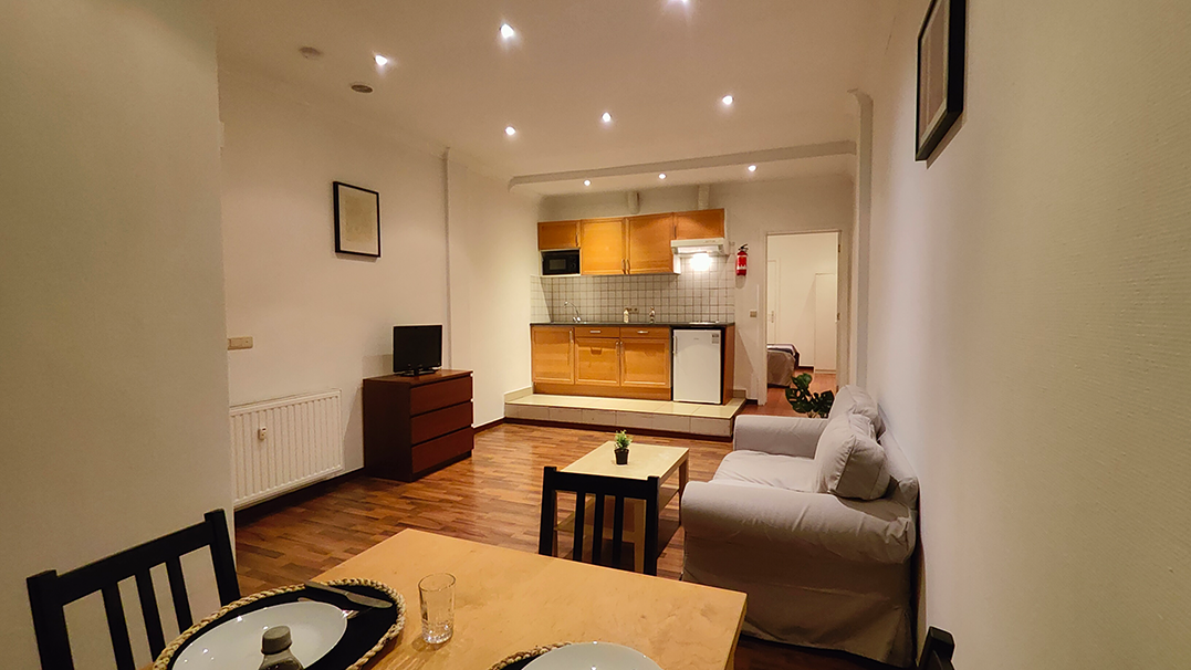 En entrant dans l’appartement, vous avez un accès direct depuis la rue via une entrée dédiée. En pénétrant à l’intérieur, vous découvrirez un espace de vie spacieux avec une grande baie vitrée qui baigne la pièce de lumière naturelle. La cuisine ouverte est équipée de toutes les commodités, notamment un réfrigérateur et un four à micro-ondes, facilitant la préparation des repas. Le salon est judicieusement meublé pour offrir tout le nécessaire pour un séjour confortable pour deux personnes.