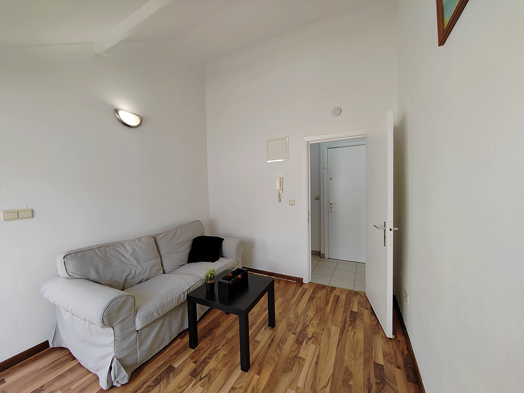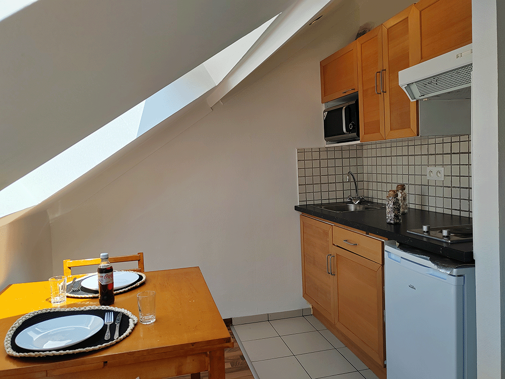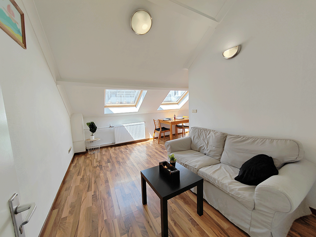 En entrant dans l’appartement, vous serez immédiatement frappé par la luminosité de l’appartement. Le salon confortable est équipé d’un canapé confortable et d’une table à manger, parfaits pour se détendre après une longue journée de travail ou recevoir des invités. La cuisine est entièrement équipée avec tous les appareils nécessaires, tels qu’un réfrigérateur, une cuisinière et un four à micro-ondes. La chambre principale dispose d’un lit confortable et d’un rangement pratique pour vos vêtements et effets personnels. Vous pouvez également profiter d’une salle de bain privée accessible depuis la chambre, équipée d’une petite baignoire et de tout ce dont vous avez besoin pour votre routine quotidienne. Cet appartement en location est entièrement meublé et équipé pour répondre à tous vos besoins. Tout ce que vous avez à faire est d’apporter vos sacs et de vous installer confortablement. La propriété est située au dernier étage d’un petit immeuble calme et sécurisé, offrant une intimité et une tranquillité absolues.