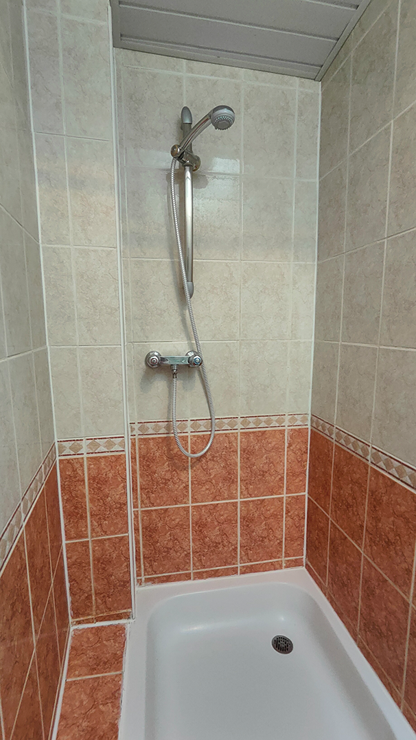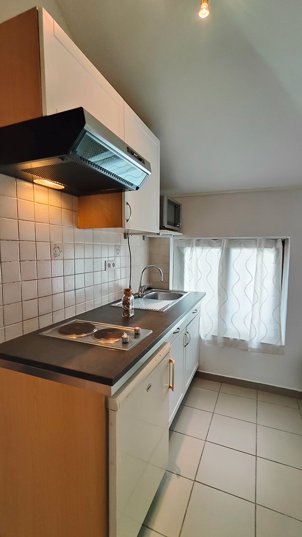 Upon entering, you’ll find a hallway that leads directly to the bathroom with a shower and a toilet. The studio is thoughtfully furnished, offering all the essentials to ensure a comfortable stay for both individuals and couples. It features a double bed and ample storage space for your belongings. The open and well-equipped kitchen includes a stovetop, refrigerator, and microwave, allowing you to prepare your own meals if you wish.
