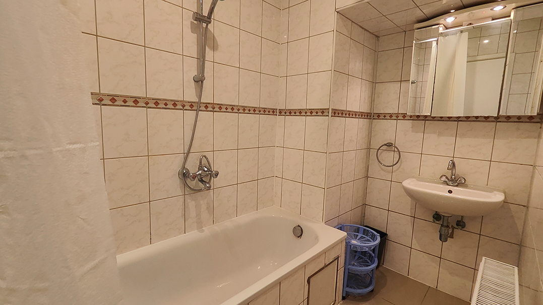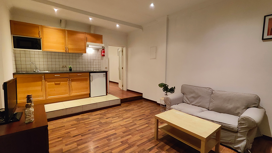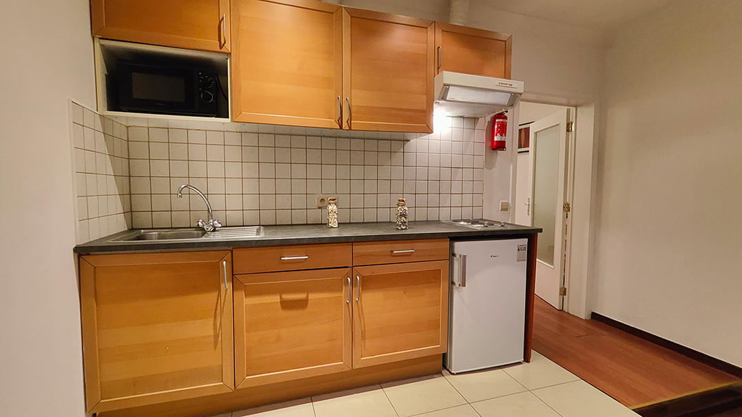 Upon entering the apartment, you have direct access from the street via a dedicated entrance. Stepping inside, you’ll find a spacious living area with a large bay window that bathes the room in natural light. The open kitchen is equipped with all the essentials, including a refrigerator and a microwave, making meal preparation a breeze. The living area is thoughtfully furnished to provide all the essentials for a comfortable stay for two people.