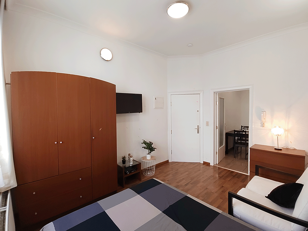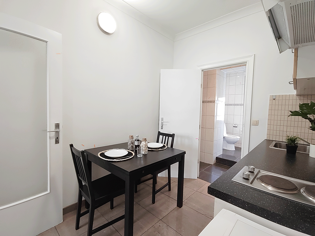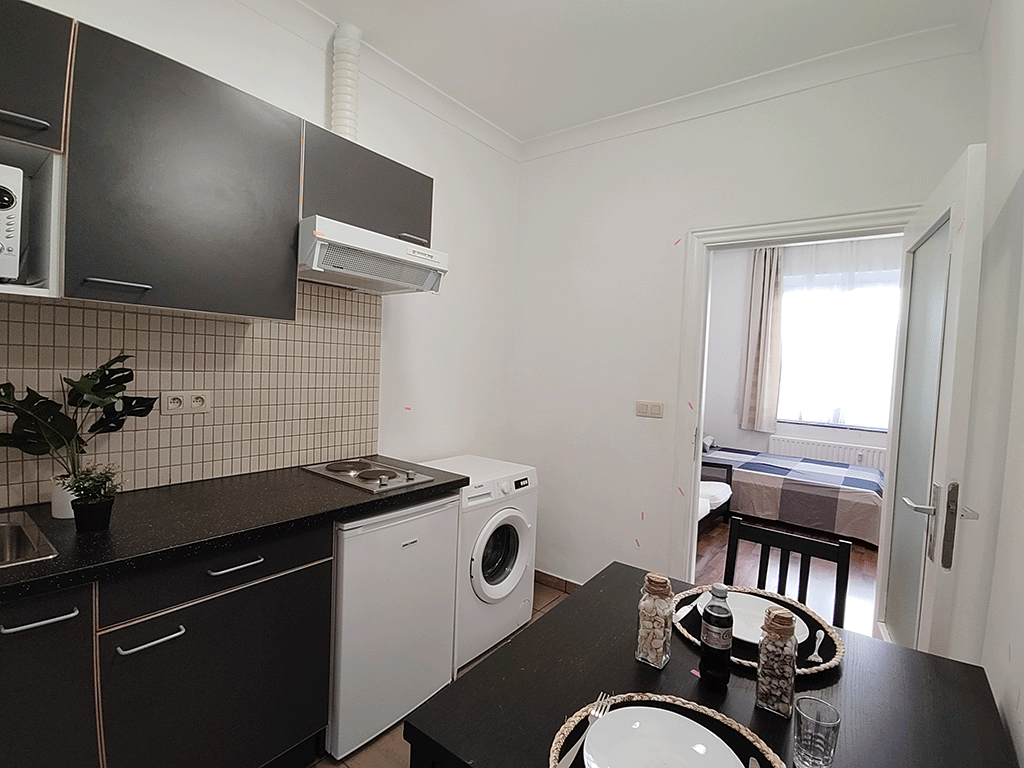 The apartment consists of a fully equipped kitchen, including a refrigerator, a stovetop, and a microwave oven. Additionally, you will find all the necessary connections to install your own washing machine, making this furnished apartment even more appealing.