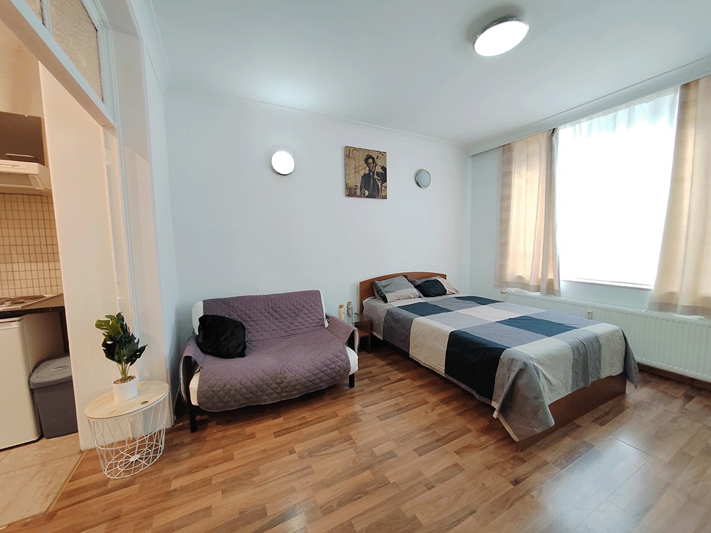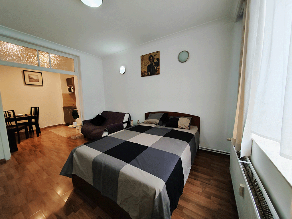 Step into the studio’s cozy ambiance, where a dedicated sleeping area awaits, featuring a plush double bed for a restful night’s sleep. The thoughtfully designed kitchenette comes complete with essential amenities, including a refrigerator, stove, and microwave oven. A well-appointed dining area with a table and chairs for two provides a perfect setting to enjoy meals or work comfortably during your stay. The private bathroom boasts a small bathtub, a sink, and a toilet, ensuring your convenience and privacy. Additional amenities include central heating and a flat-screen TV for your entertainment needs.