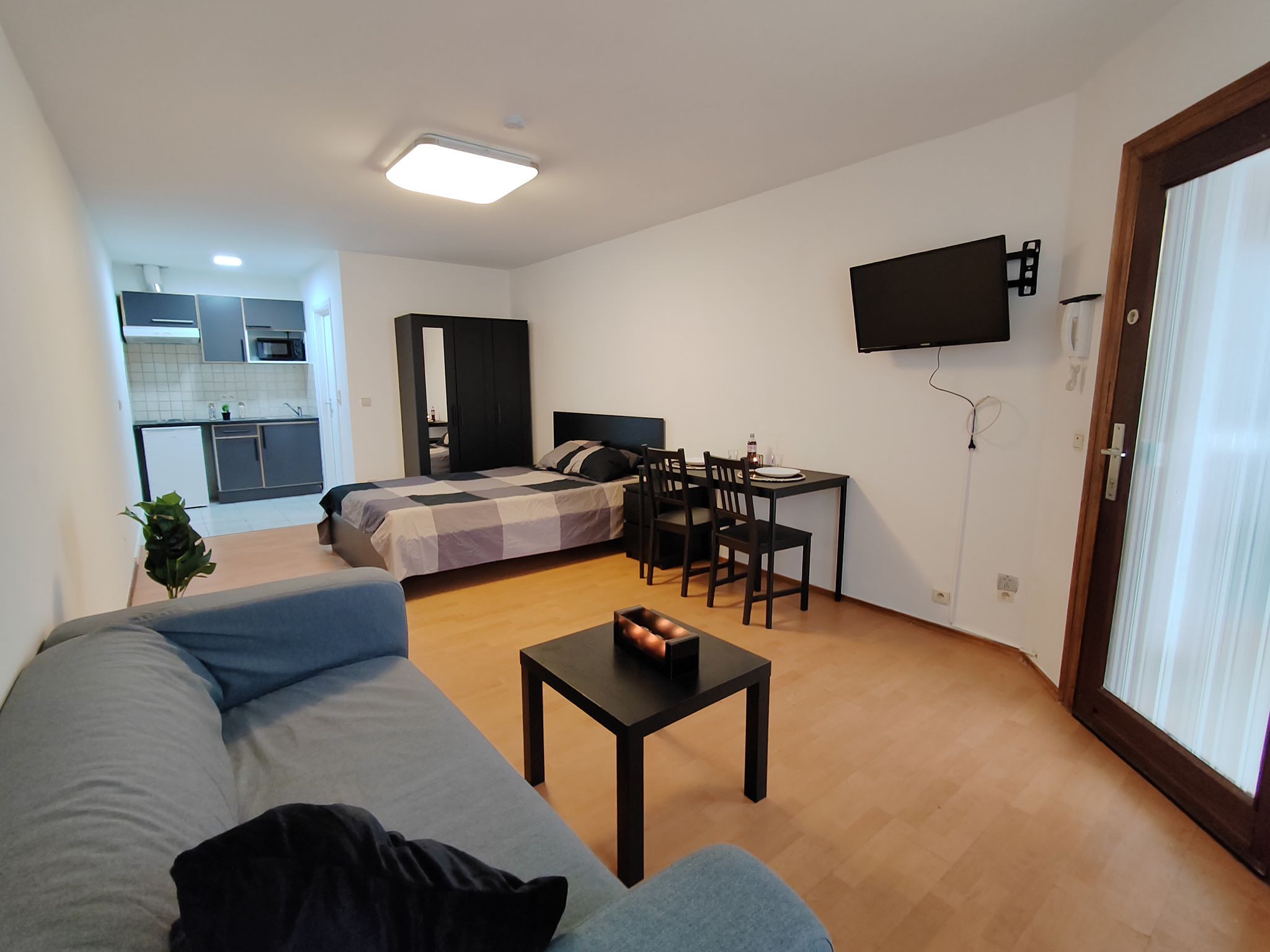 The studio has a sleeping area with a comfortable double bed, a kitchenette equipped with a refrigerator, a stove, a microwave oven. There is also a dining table and chairs for two people to enjoy your meals or work comfortably. The private bathroom is equipped with a small bathtub, a sink and a toilet. The studio is also equipped with central heating and a flat screen TV for your entertainment.