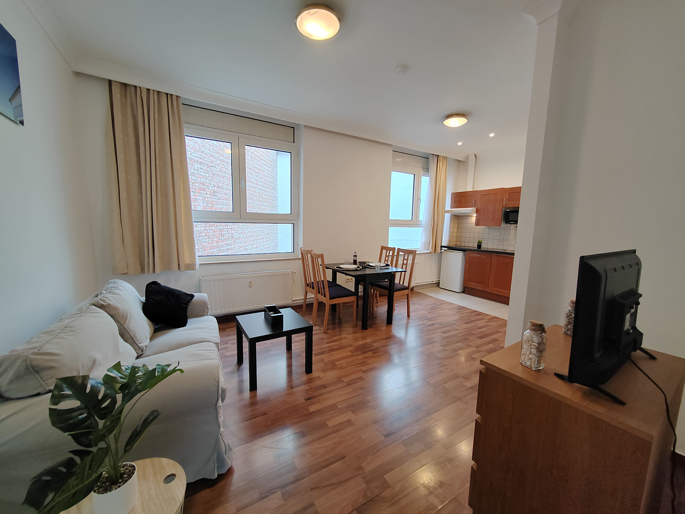 Welcome to this elegant apartment for rent in Brussels, ideally located at the entrance to the city center, facing the magnificent Canal. This furnished one-bedroom apartment is nestled on the 4th floor of a secure building, equipped with an elevator and surveillance cameras, offering its residents unparalleled peace of mind. When you walk through the front door, you will discover a spacious furnished living room which opens into a fully equipped kitchen. There you will find a refrigerator, a hob, and a microwave, providing everything you need for comfortable living. The living room also has a private bathroom, including a bathtub and toilet for your convenience. The spacious and welcoming master bedroom can comfortably accommodate two people, ensuring peaceful nights’ sleep. The apartment is perfectly suited to those who want to be close to the heart of Brussels while enjoying easy access to the surrounding neighborhoods. Metro, tram and bus lines can be reached in just 5 minutes on foot, allowing you to quickly move around the city. Additionally, you will be delighted to discover numerous grocery stores just 100 meters away, as well as the city’s main shopping center a 10-minute walk away. Additionally, a variety of restaurants, museums, bars and other points of interest are within your reach. In summary, this apartment for rent in Brussels is the ideal place to fully experience the Belgian capital. Don’t miss this opportunity to settle into a furnished apartment, close to everything Brussels has to offer. Do not hesitate to contact us for more information or to schedule a visit.DYPRES 4-1