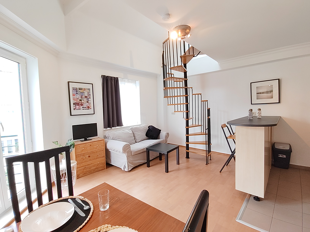 The apartment features a cozy mezzanine bedroom that offers a private sanctuary with access to an adjoining bathroom. For your convenience, a separate WC is located near the entrance, ensuring that your privacy and personal space are well-maintained. This thoughtful design adds a practical touch to the apartment.