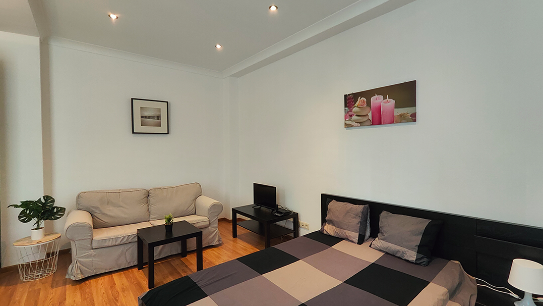 Located on the 2nd floor of a small building with an elevator, this furnished apartment rental is perfect for young professionals, students, or anyone looking to be in the heart of the city. With a comfortable double bed and a separate fully equipped kitchen, this apartment is ideal for couples.