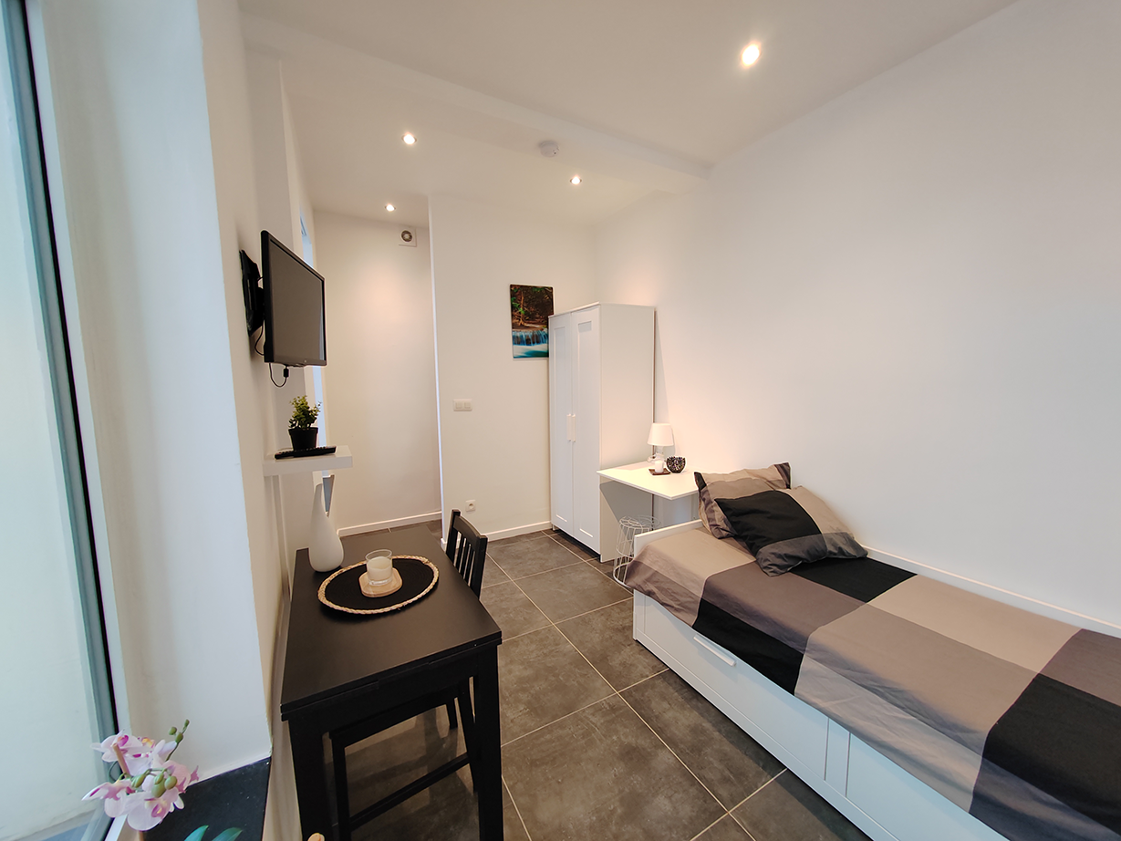 The studio is functionally furnished, including a equipped kitchenette, a private bathroom, and a comfortable sleeping area with a single bed. It’s the perfect place to unwind after a busy day.